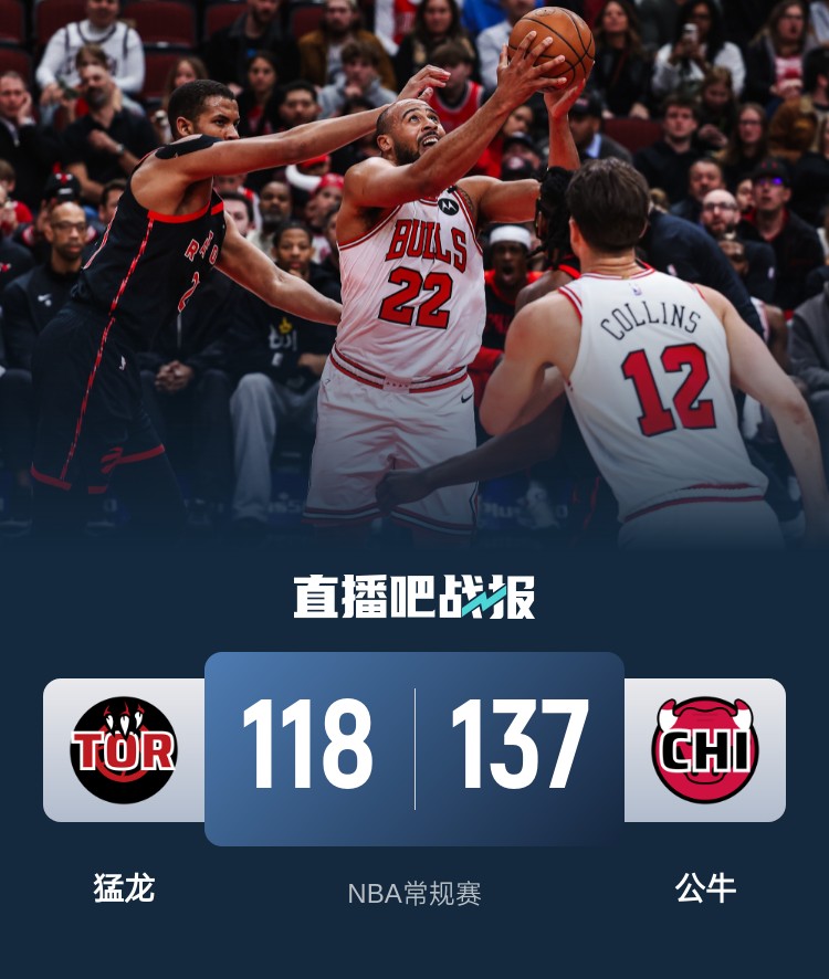 此役一上来两队迅速找到节奏,猛龙内外结合率先占优,武切维奇手感滚烫连中三分,公牛末段发力后来居上,首节结束时公牛领先7分,次节回来,两队你来我往继续对攻,基迪连投带罚不断取分,半场战罢,公牛已经领先13分。易边再战后双方进攻火力放缓,中段公牛一波10-0彻底拉开比分,并带着23分优势进入末节,末节上来,猛龙难以打出追分高潮,比赛提前失去悬念,最终公牛137-118大胜对手锁定附加赛。