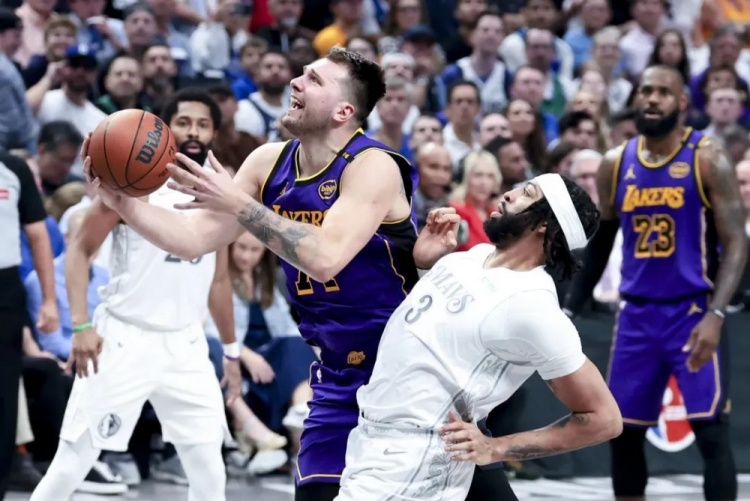 ——湖人靠外围阵拉开空间,欺负浓眉经常在禁区外;且独行侠不敢收弱侧,于是勒布朗第四节好几个换手反篮,卢卡也接茬玩右侧突破左反篮:独行侠于是被打崩。