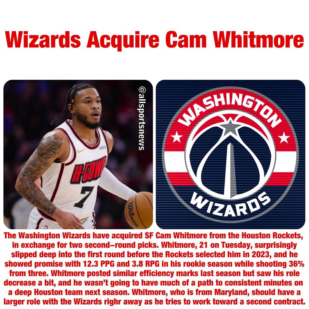 07月06日讯 据ESPN名记Shams Charania报道,多位消息人士透露,火箭将2023年20号秀、侧翼球员惠特摩尔送至奇才,换来两个次轮签(2026年公牛、2029年国王),这笔交易可于7月7日进行官宣。