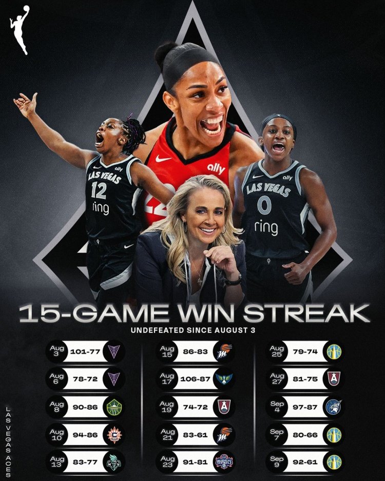 本场比赛之后,拉斯维加斯王牌的连胜已经达到15场,继续刷新队史连胜记录。她们也成为了WNBA历史上第四支拿到至少15连胜的球队,而WNBA的连胜记录是2001年洛杉矶火花的18连胜。
