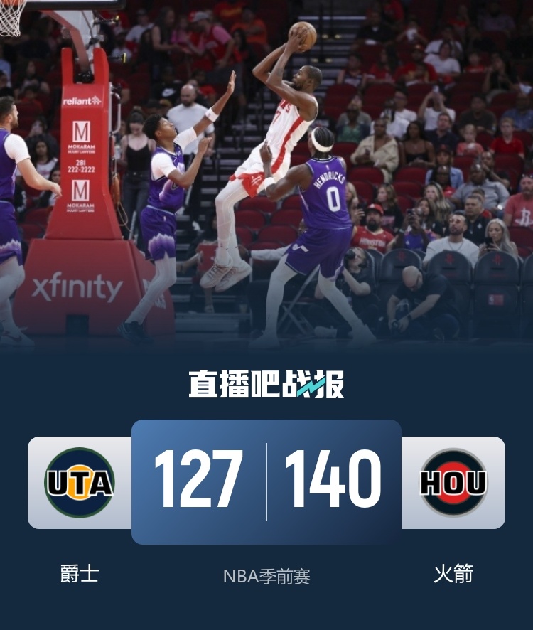 季前赛-KD首秀20分 申京13+5+13 阿门19+7+6 火箭击败爵士