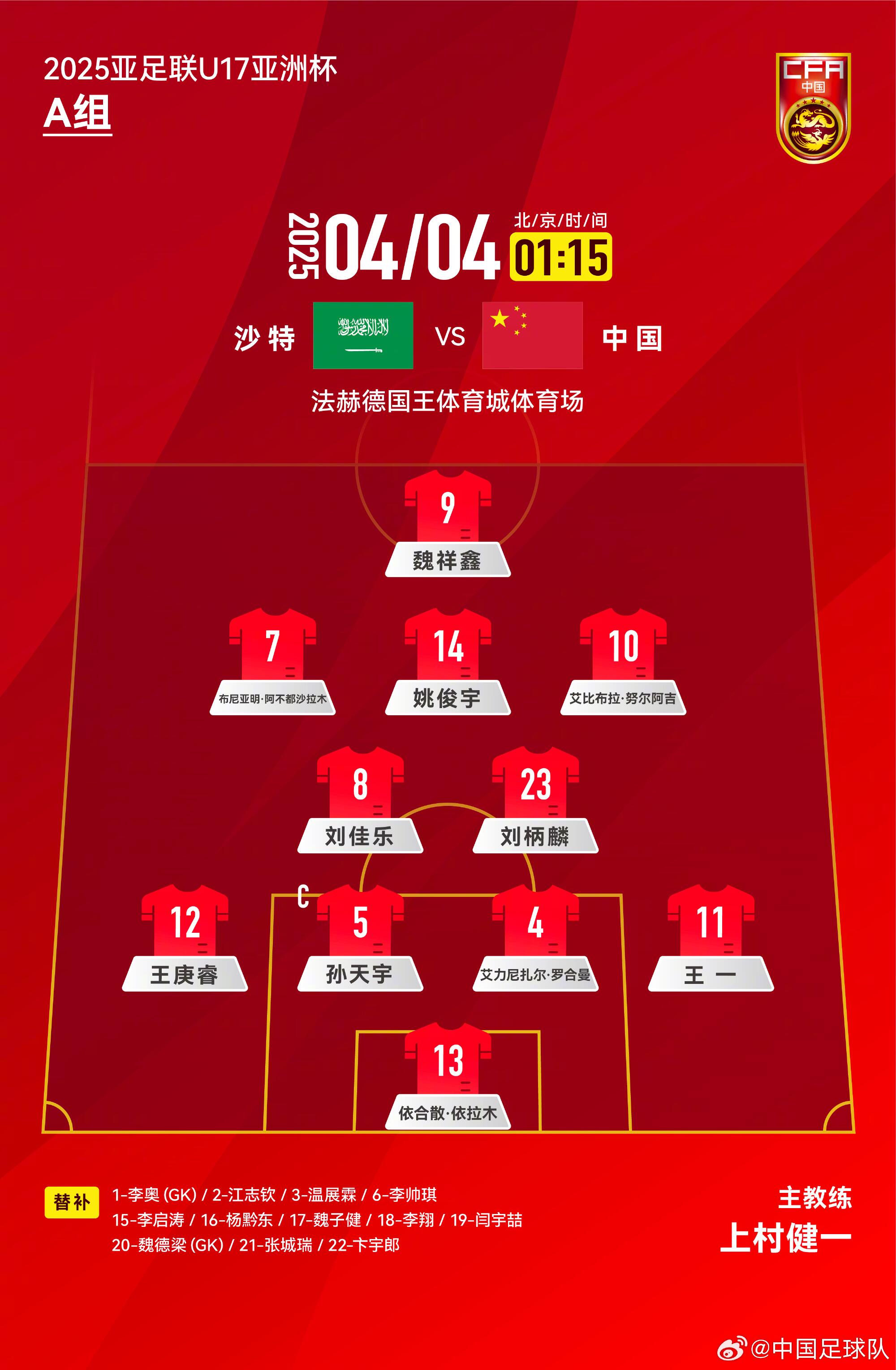 U17亚洲杯-国少vs沙特首发:艾比布拉先发,魏祥鑫、布尼亚明出战