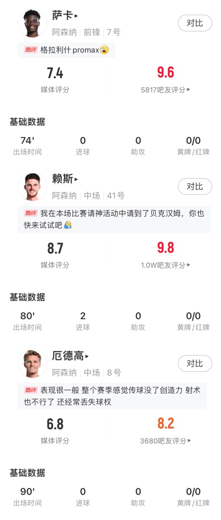 欧冠1/4决赛焦点战阿森纳vs皇马,首回合枪手主场3-0大胜,本场两队8名亿元先生全部先发,身价1.1亿欧的赖斯任意球双响,打出生涯代表作。