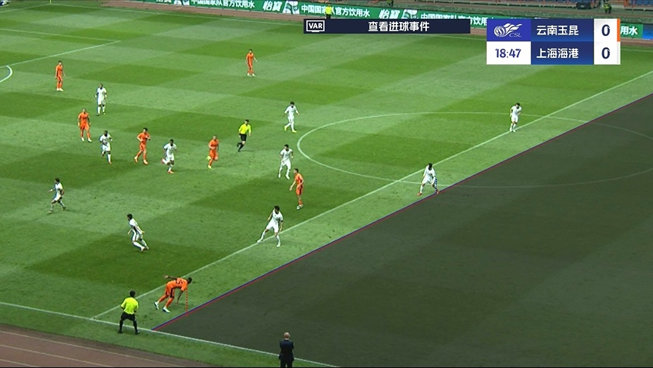 中超联赛第9轮,云南玉昆VS上海海港,比赛第15分钟,云南玉昆进球,第一助理裁判员未判罚越位,裁判员初始决定为进球有效。VAR经检查并划线后,确认攻方处越位位置并进行介入,裁判员改判进球前云南玉昆25号越位犯规,进球无效。