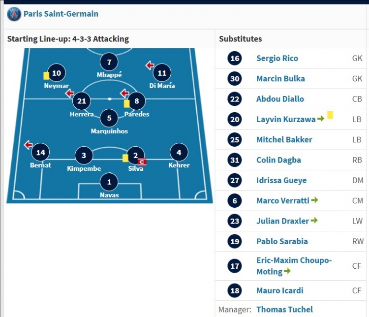 巴黎首发:1-纳瓦斯、4-科雷尔、2-蒂亚戈-席尔瓦、3-金彭贝、14-贝尔纳特、21-埃雷拉、5-马尔基尼奥斯、8-帕雷德斯、11-迪玛利亚、7-姆巴佩、10-内马尔