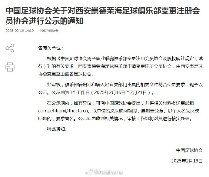 中国足协公示西安崇德荣海足球俱乐部从西安市足协变更注册地到山西省足协。俱乐部公众号发出的文章称球队将改名为山西省足球俱乐部。继上赛季2家俱乐部后,这是《中国足球协会男子职业联赛俱乐部变更注册会员协会及股权转让规定(试行)》施行来第8家进行异地转移的男足职业俱乐部: