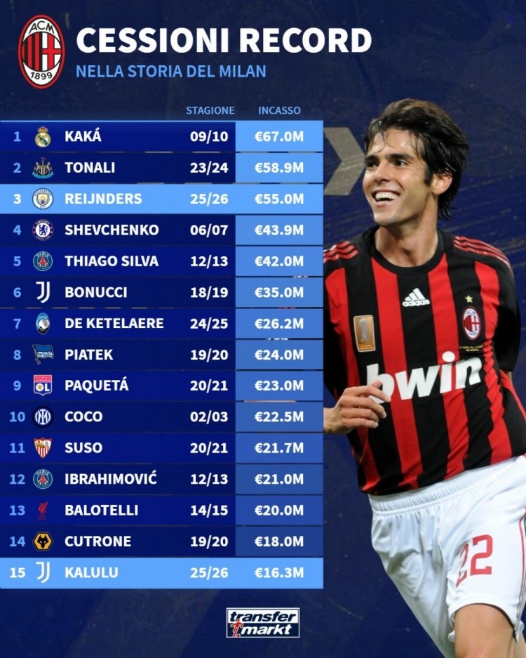 米兰出售球员转会费榜:卡卡6700万欧居首,托纳利、赖因德斯前三