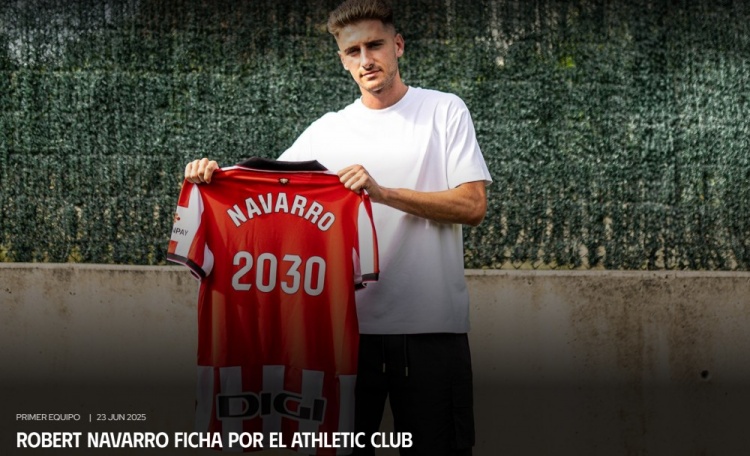 毕尔巴鄂竞技俱乐部与球员罗贝托-纳瓦罗已达成协议,这位自由身的前锋将效力俱乐部直至2030年6月30日。现年23岁的他,在奥萨苏纳、巴塞罗那、摩纳哥和皇家社会青训营积累了丰富的训练经验。他17岁时即进入皇家社会的二线队。他总计在顶级联赛出场89次,其中包括洲际比赛经历,并在欧联杯中打入两球。