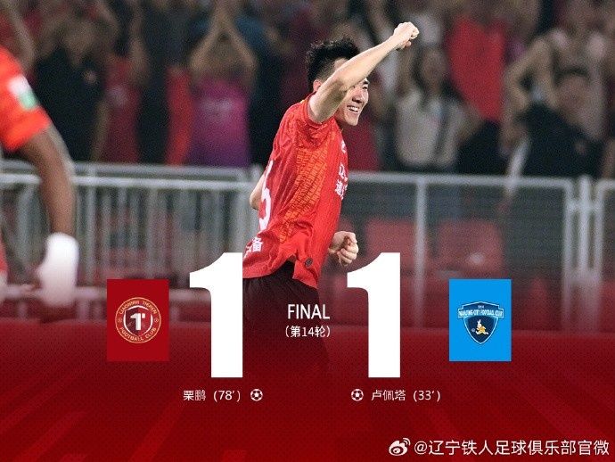 6月28日19点,华润饮料2025中国足球甲级联赛第14轮,辽宁铁人农商银行主场迎战南京城市。在先丢一球的情况下,凭借栗鹏的进球,辽宁铁人农商银行主场1-1战平南京城市。