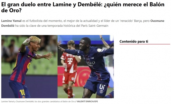 此外,在西甲联赛中与皇家马德里进行永恒的较量并最终夺冠,其意义也不同于赢得法甲联赛。所有这些因素都需要放在天平上衡量,并且要考虑到投票的是来自世界各地的记者,包括那些偏远地区的记者,他们看到的往往是那些震撼世界、引发轰动的精彩表现。而在这方面,亚马尔是无可匹敌的。