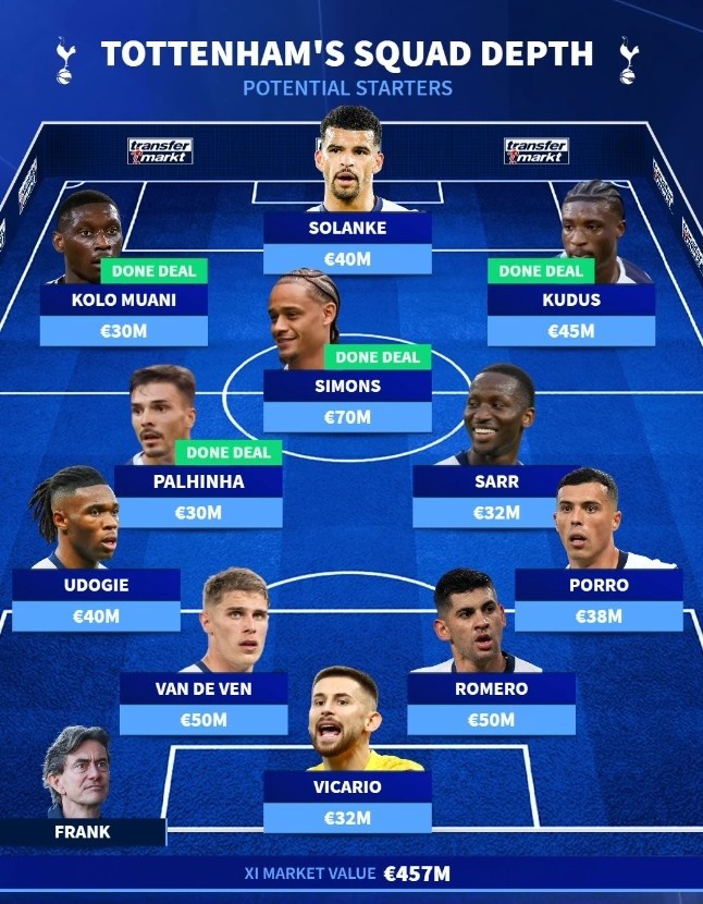 本赛季能排第几?德转列热刺两套阵容:哈维-西蒙斯领衔5名新援