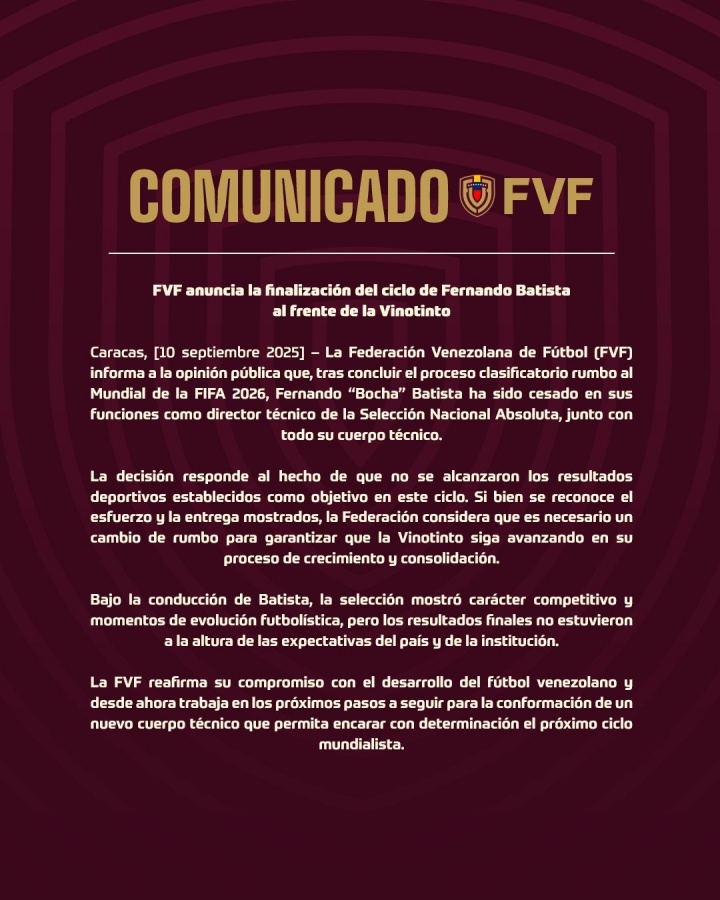 随着2026年世界杯预选赛进程结束,巴蒂斯塔即日起不再担任国家成年队主教练职务,其整个教练团队也一起离任。此决定基于该执教周期内未能达成既定体育目标的考量。尽管认可其展现的努力与奉献精神,但联合会认为必须做出方向性调整,以确保委内瑞拉能持续在成长与巩固的道路上前进。