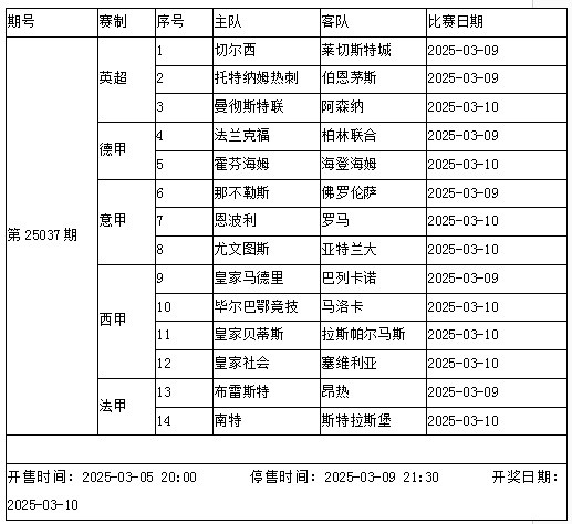 传足胜负彩第25037期中不乏焦点赛事,其中曼联对阵阿森纳尤为引人关注。此外,切尔西主场面对莱切斯特城,尤文与亚特兰大将在都灵安联球场展开对决,皇马则德比对阵巴列卡诺。